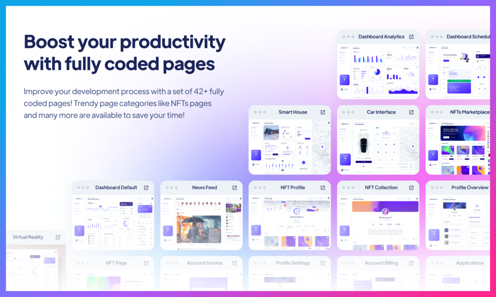 With Horizon UI PRO you will find many examples for pages like NFTs Pages, Authentication Pages, Profile and so on. Just choose between a Basic Design or a cover and you are good to go!