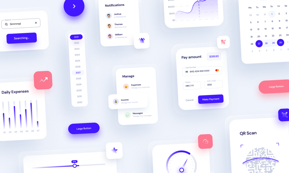 - Buttons, Sliders, Text Inputs, Checkboxes, Radios, Toggles, Increment Stepper, Tabs, Panels, Accordions, Badges, Pagination